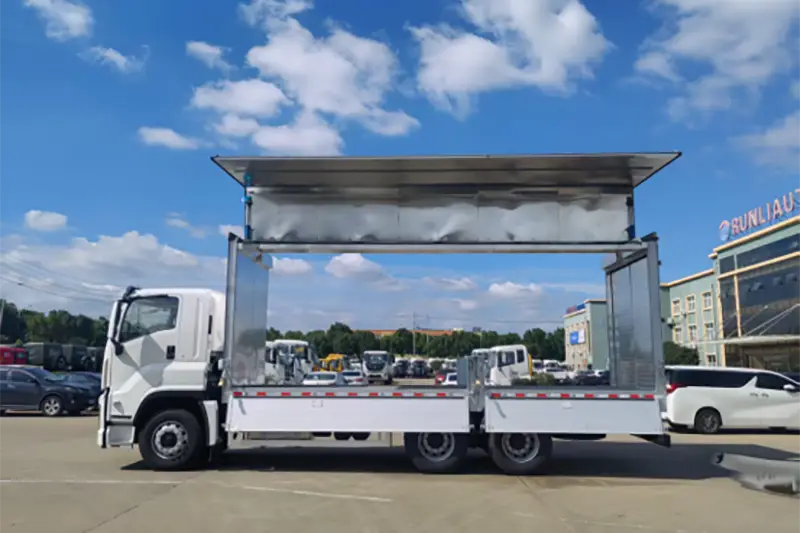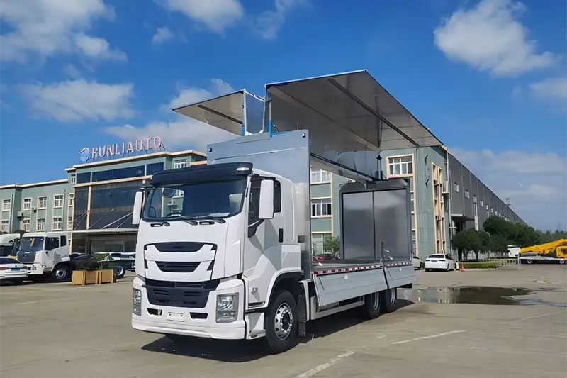 O Runli Aluminum Alloy Wingspan Truck, também amplamente conhecido como van com abertura de asa ou caminhão baú com desdobramento lateral, é um caminhão especial de alto desempenho modificado a partir do chassi Isuzu 6X4 genuíno, atualizado para resolver o problema de baixa eficiência de carga e descarga para cargas grandes, pesadas e superdimensionadas. Ao contrário dos tradicionais caminhões baú com abertura apenas traseira, os painéis laterais da caixa de carga e o meio teto se desdobram hidraulicamente como asas, criando uma espaçosa área de carga tridimensional que suporta manuseio multidirecional lateral, dianteiro e traseiro. É uma ferramenta central de transporte logístico amplamente utilizada na distribuição global de carga a granel, entrega de equipamentos industriais e transporte de produtos agrícolas, equilibrando perfeitamente a proteção de carga e a eficiência de manuseio para compradores atacadistas internacionais e empresas de logística dedicadas.